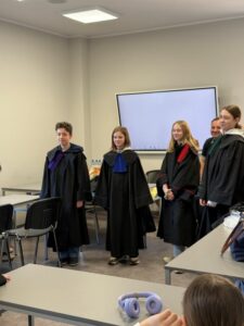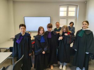 W ramach grupy młodszej przeprowadzono zajęcia integracyjne „Ster na prawo? Doskonale. Witajcie na Wydziale”, mające na celu zapoznanie uczestników z uczelnią i budowanie relacji w grupie. Następnie odbyły się zajęcia pt. „Prawa dziecka a realia szkoły: teoria i praktyka”, prowadzone przez Pana Mariusza Dubojskiego Dyrektora Wydziału Kształcenia Ogólnego i Specjalnego Kuratorium Oświaty w Szczecinie, podczas których omówiono praktyczne aspekty funkcjonowania praw dziecka w środowisku szkolnym. Spotkanie zakończyła symulacja rozprawy sądowej z Panem dr Przemysławem Mijalem „Sąd sądem, ale sprawiedliwość musi być po naszej stronie”, umożliwiająca uczestnikom zdobycie pierwszych doświadczeń w zakresie wystąpień i argumentacji prawniczej.