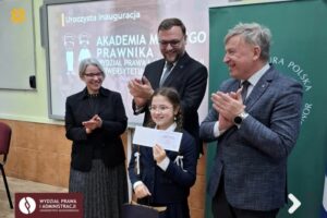 Akademia Młodego Prawnika to projekt, który wychodzi naprzeciw wizji naszego Wydziału – jako miejsca, które w nowoczesny sposób kształci nie tylko studentów, ale również jest miejscem, gdzie wiedzą prawniczą dzielimy się z uczniami z wielu miast naszego województwa. Dumą napawa nas myśl, że w tym roku na nasze zaproszenie odpowiedziało 15 szkół podstawowych oraz 16 szkół ponadpodstawowych nie tylko ze Szczecina, ale także m.in. z Polic, Czaplinka, Stargardu, Klinisk Wielkich, Gryfic. Podczas uroczystości uczestnicy odebrali symboliczne indeksy z rąk: prof. dr hab. Andrzeja Skrendy – Prorektora ds. Nauki Uniwersytetu Szczecińskiego, dr Beaty Kanarek – Prodziekana ds. Kształcenia WPiA US oraz Mariusza Dubojskiego – Dyrektora Wydziału Kształcenia Ogólnego i Specjalnego Kuratorium Oświaty w Szczecinie.