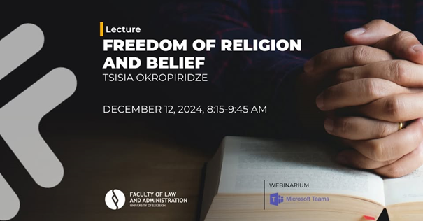 On December 12, 2024 at 8.15 a lecture was held at the Faculty of Law and Administration of the University of Szczecin entitled Freedom of Religion and Belief”, in which members of this Faculty, the academic community and the gathered guests took part. The event was held in English remotely, via MS Teams, and registration was required. The lecture was delivered by Ms. Tsisia Okropiridze from the Faculty of Law of the Georgian University of Sulkhan-Saba Orbeliani.
