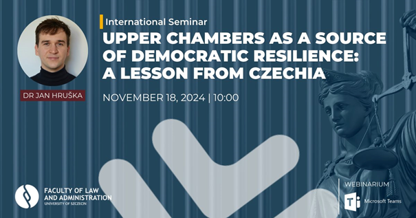 On November 18, 2024 at 8.15 a lecture was held at the Faculty of Law and Administration of the University of Szczecin entitled “Upper Chambers as a Source of Democratic Resilience: A Lesson from Czechia”, in which members of this Faculty, the academic community and the gathered guests took part. The event was held in English remotely, via MS Teams, and registration was required. The lecture was delivered by Dr Jan Hruška from Masaryk University in Brno.