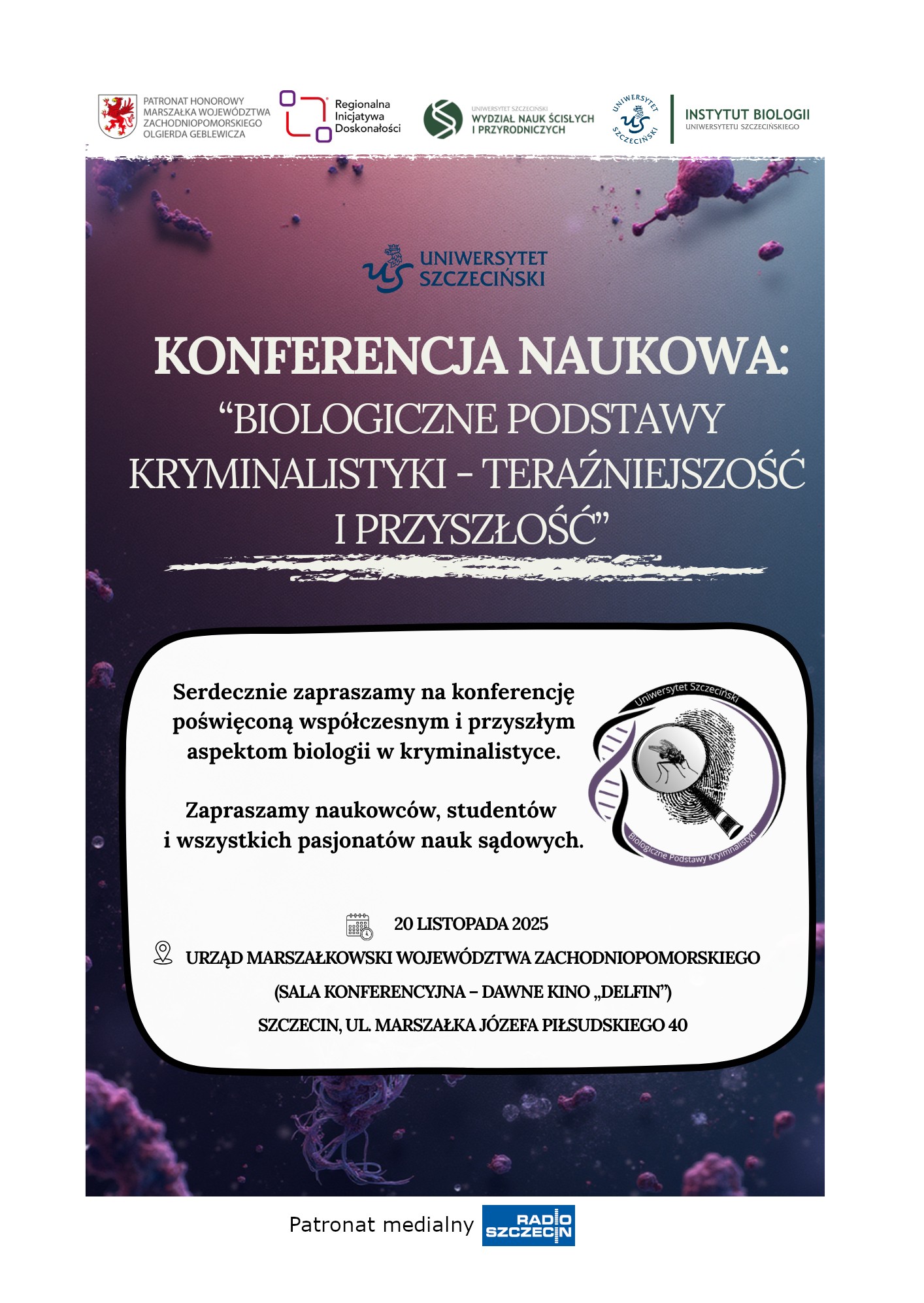 Razem z Instytut Biologii Uniwersytetu Szczecińskiego oraz Wydział Nauk Ścisłych i Przyrodniczych Uniwersytetu Szczecińskiego serdecznie zapraszamy Studentów naszego Wydziału Prawa i Administracji uniwersytetu Szczecińskiego na jednodniową konferencję poświęconą współczesnym możliwościom analiz materiału biologicznego w dochodzeniach i śledztwach. Konferencja odbędzie się dnia 20 listopada 2025 r. w Sali Konferencyjnej „Delfin” Urzędu Marszałkowskiego Województwa Zachodniopomorskiego.