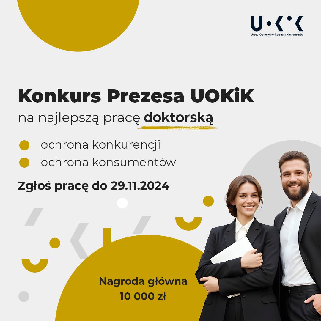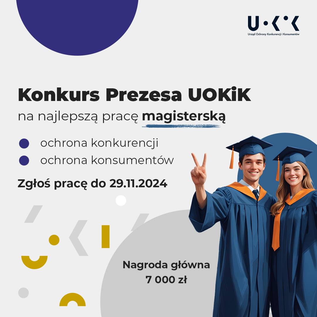 Zapraszamy do udziału w konkursie Prezesa Urzędu Ochrony Konkurencji i Konsumentów na najlepszą pracę magisterską i doktorską dotyczącą aspektów ochrony konkurencji i konsumentów. Zgłoszenia prac trwają do 29 listopada 2024 r.