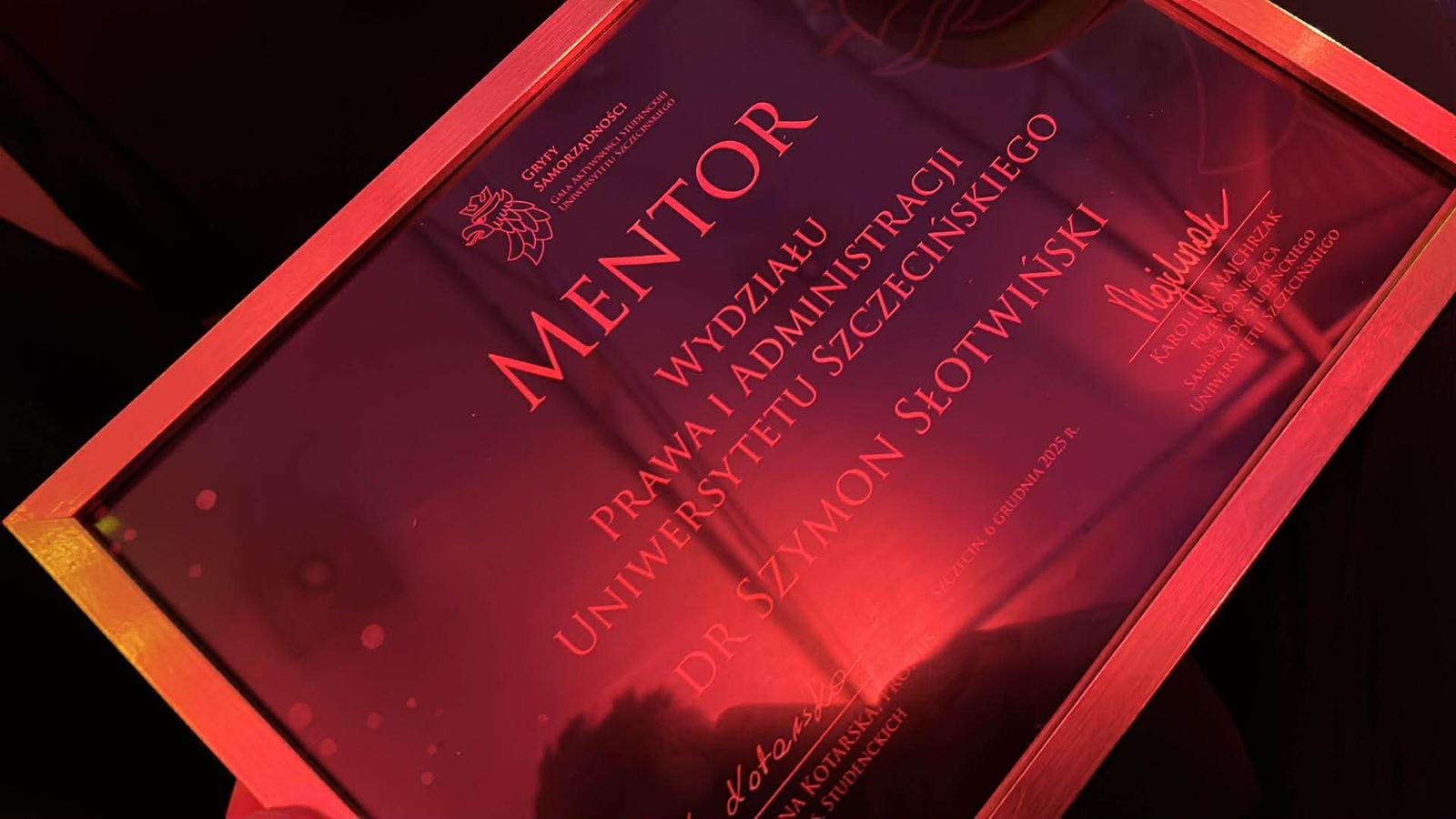 Z przyjemnością informujemy, że głosami studentów tytuł Mentora Wydziału Prawa i Administracji Uniwersytetu Szczecińskiego 2025 otrzymał dr Szymon Słowiński. To wyróżnienie trafia do osób szczególnie wspierających studentów, organizacje studenckie i wspólnotę akademicką.