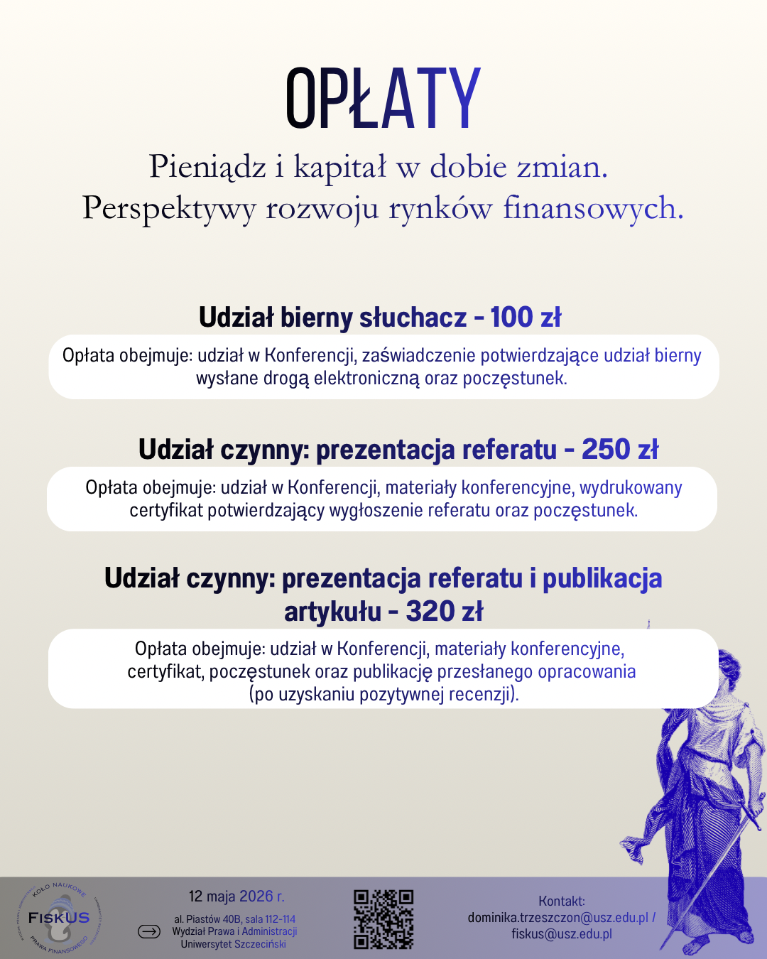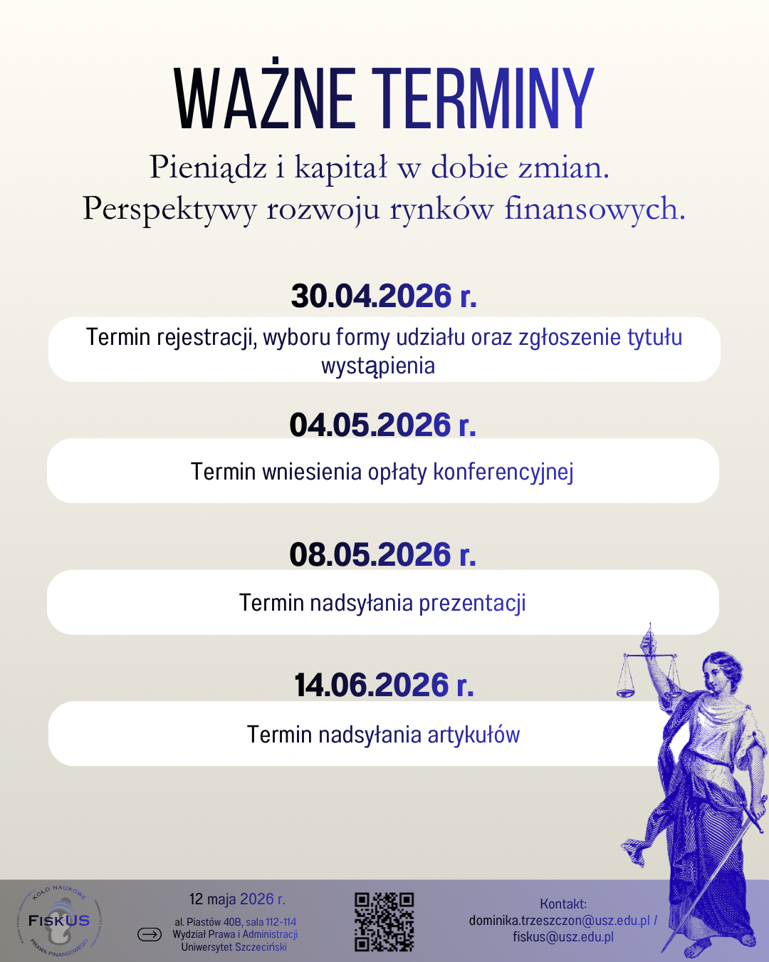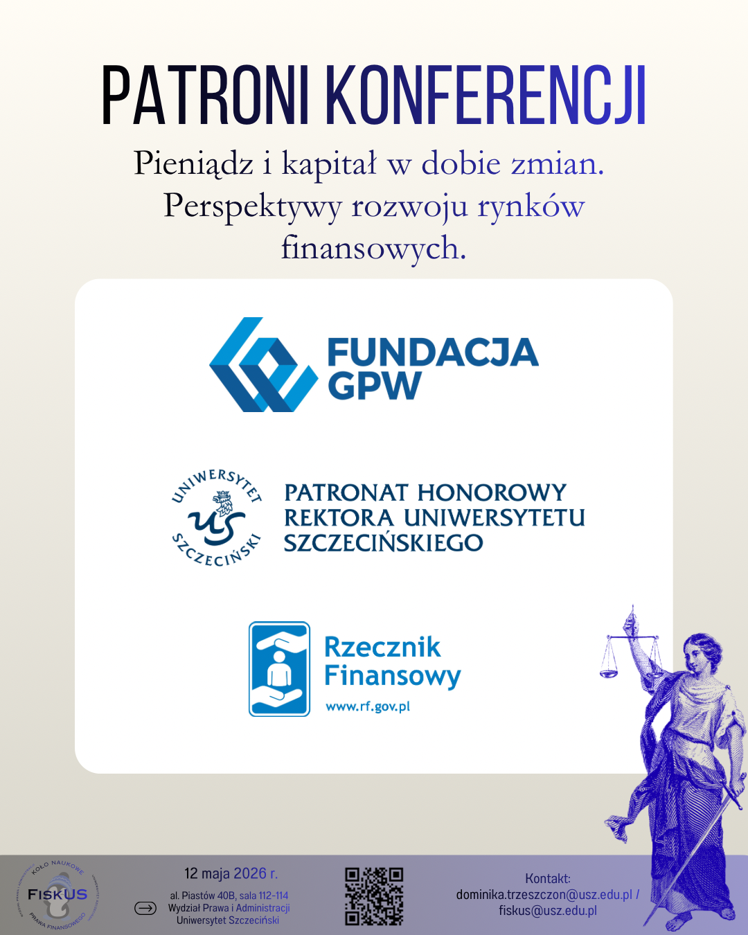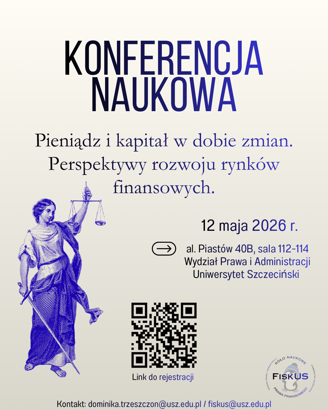 Zespół Badawczy Prawa Finansowego Wydziału Prawa i Administracji Uniwersytetu Szczecińskiego oraz Koło Naukowe Prawa Finansowego „FiskUS” serdecznie zapraszają do udziału w Ogólnopolskiej Konferencji Naukowej „Pieniądz i kapitał w dobie zmian. Perspektywy rozwoju rynków finansowych”. Celem Konferencji jest stworzenie forum wymiany poglądów na temat zmian zachodzących na rynku finansowym oraz ich konsekwencji prawnych i finansowych.