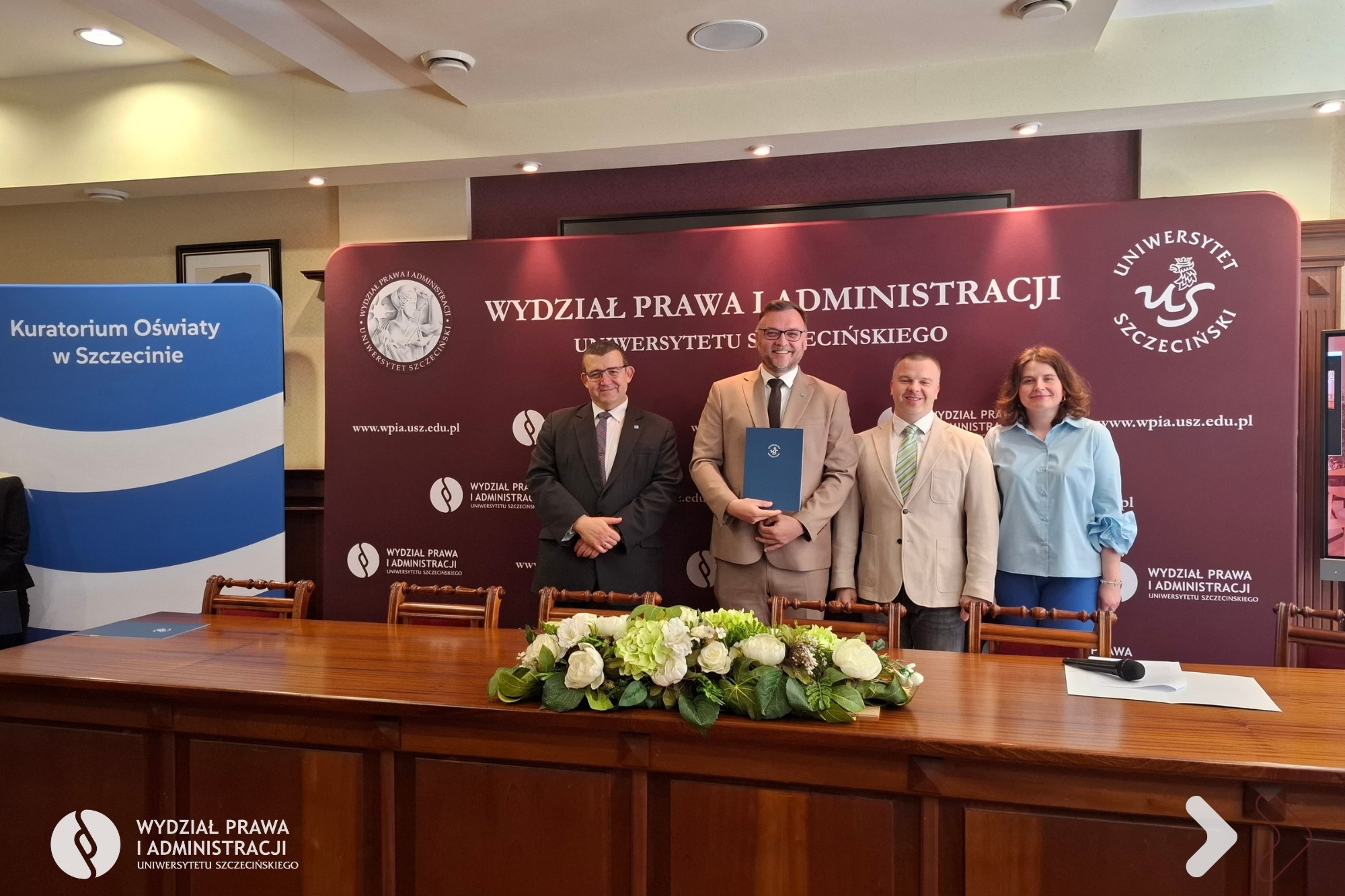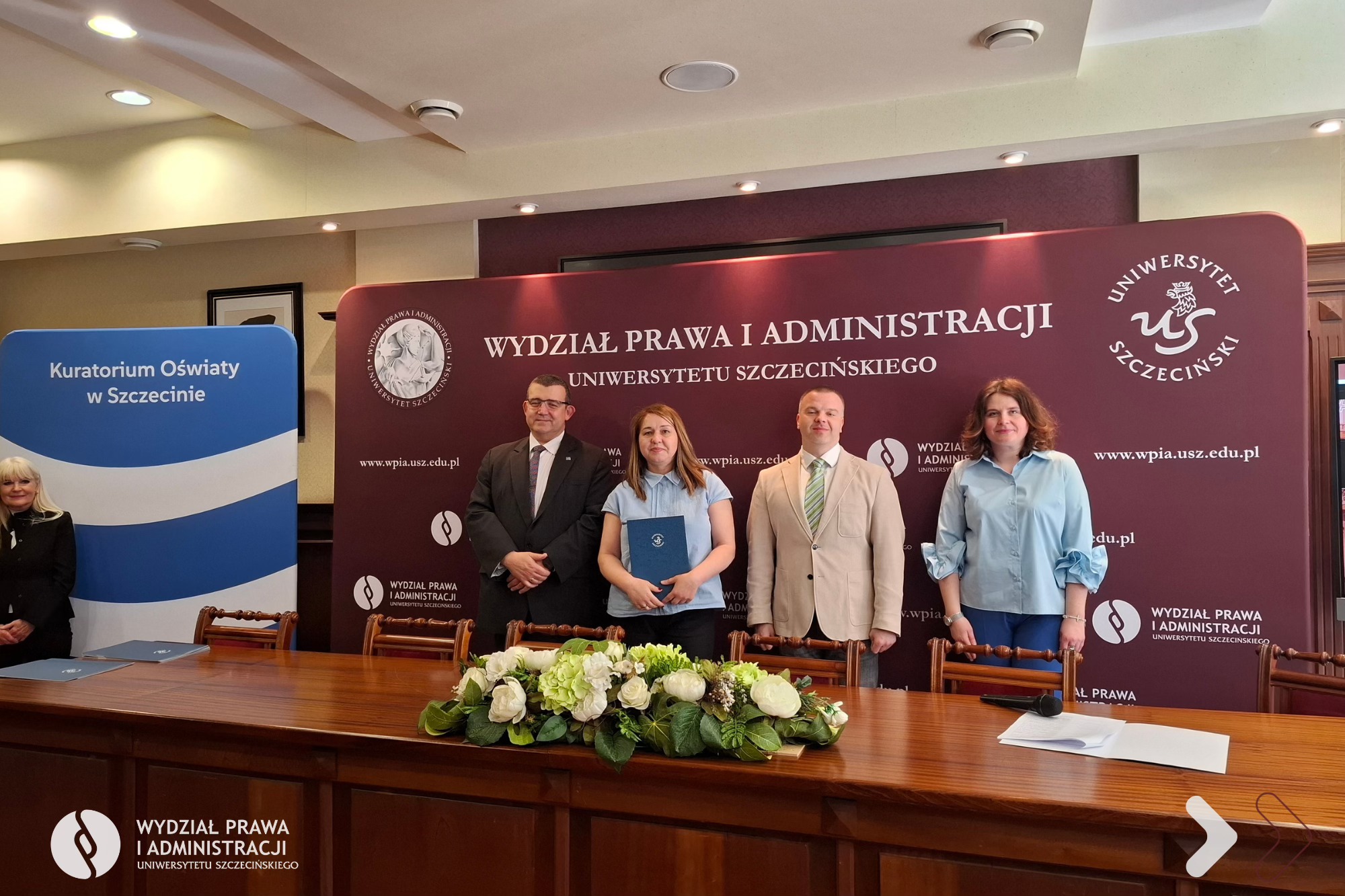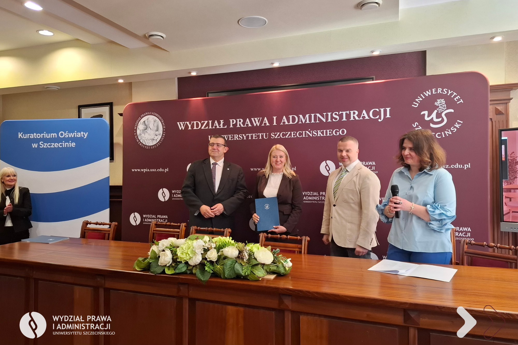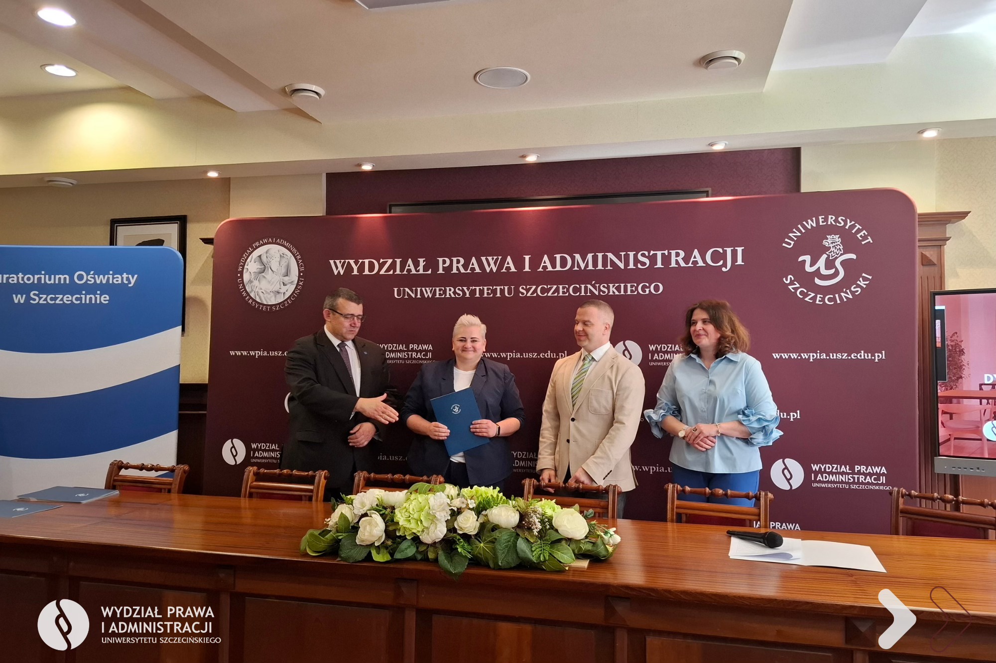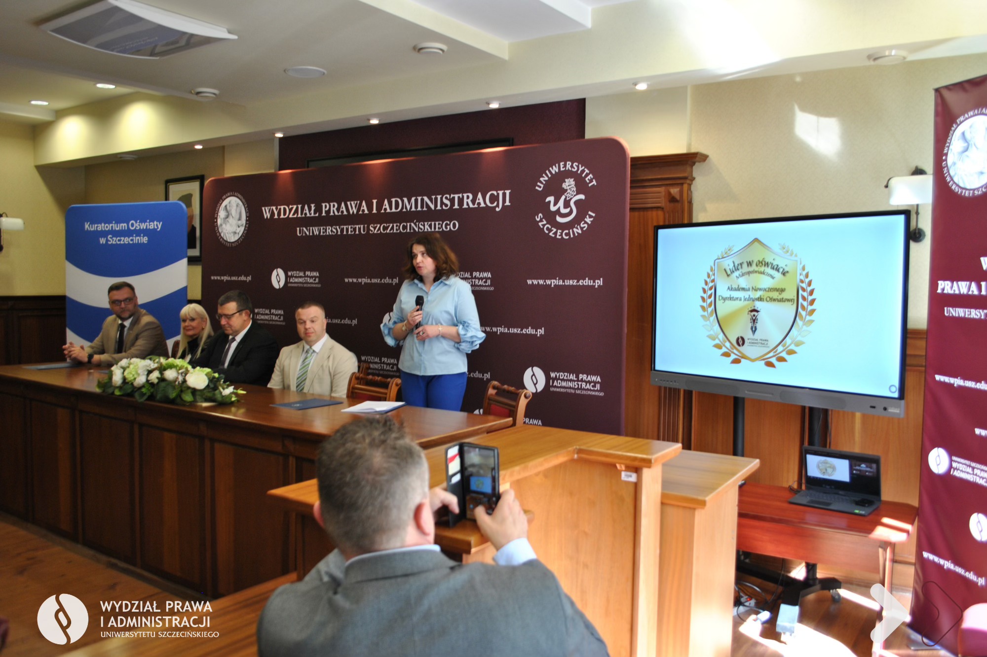 Dnia 25 kwietnia 2026 r. na Wydziale Prawa i Administracji Uniwersytetu Szczecińskiego odbyło się uroczyste zakończenie I edycji Akademii Nowoczesnego Dyrektora Jednostki Oświatowej organizowanej wspólnie z Kuratorium Oświaty w Szczecinie. W kursie dokształcającym uczestniczyło 40 dyrektorów i wicedyrektorów jednostek systemu oświaty z województwa zachodniopomorskiego.