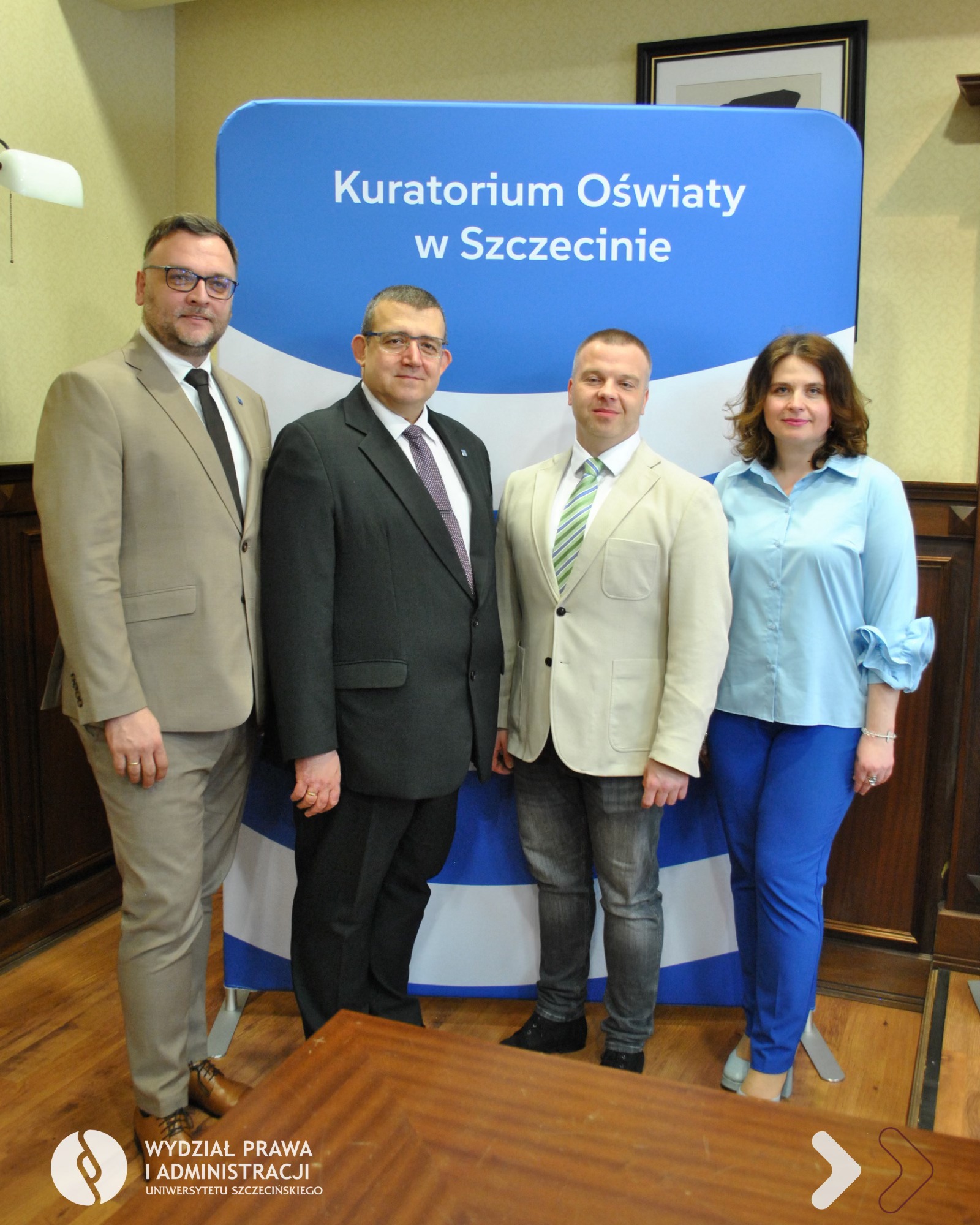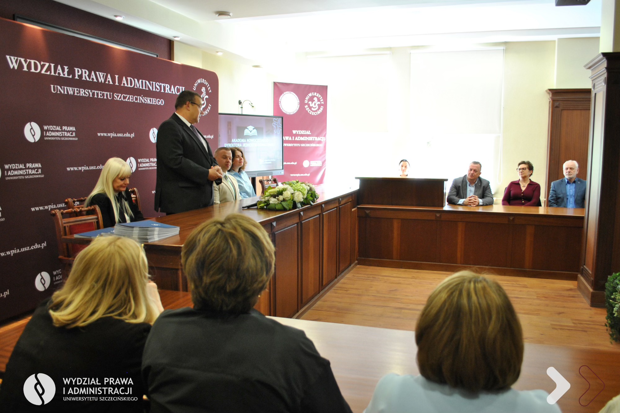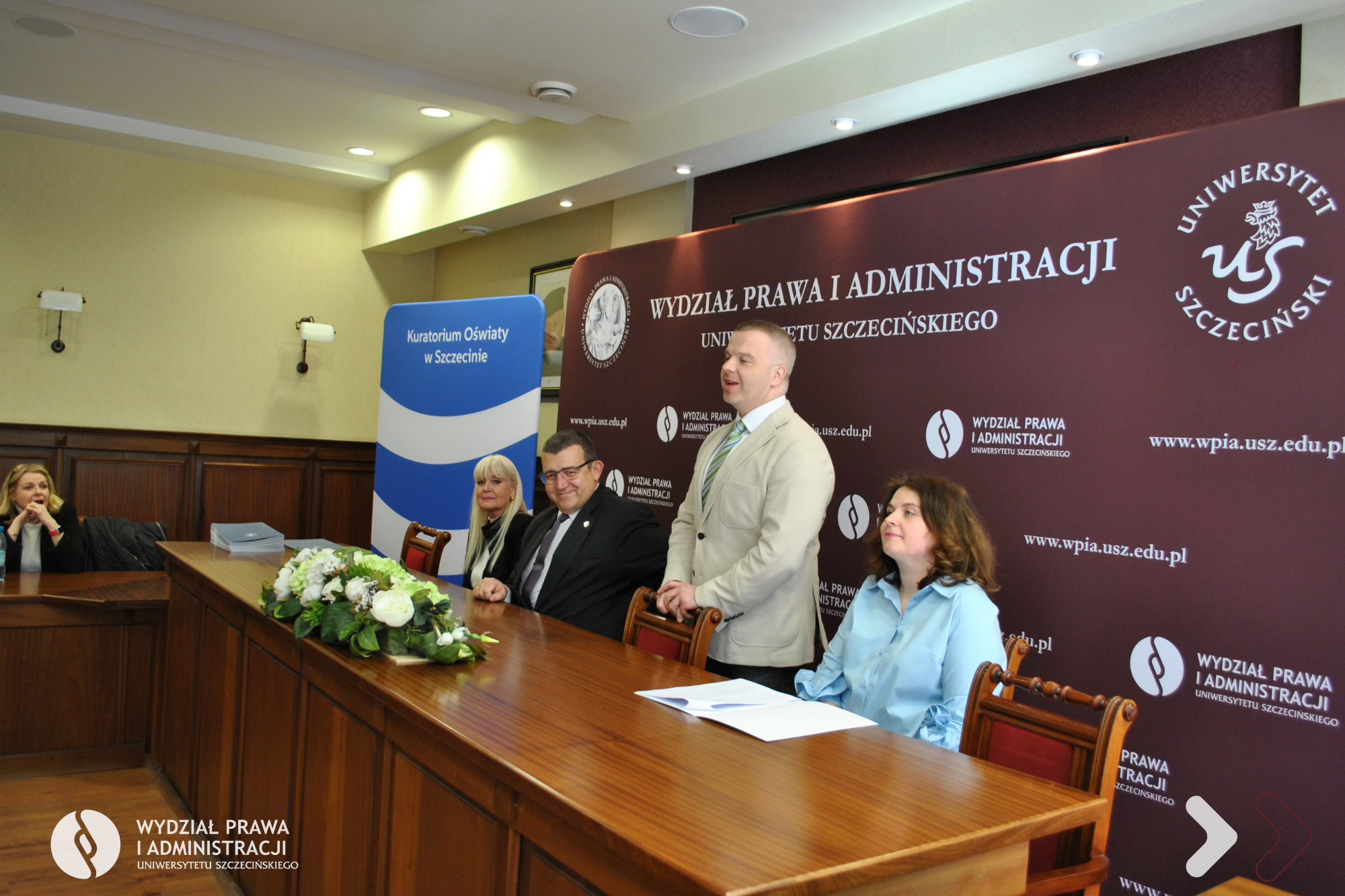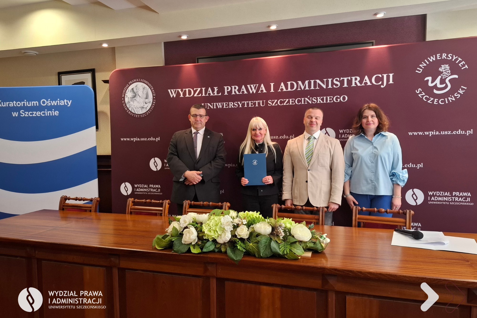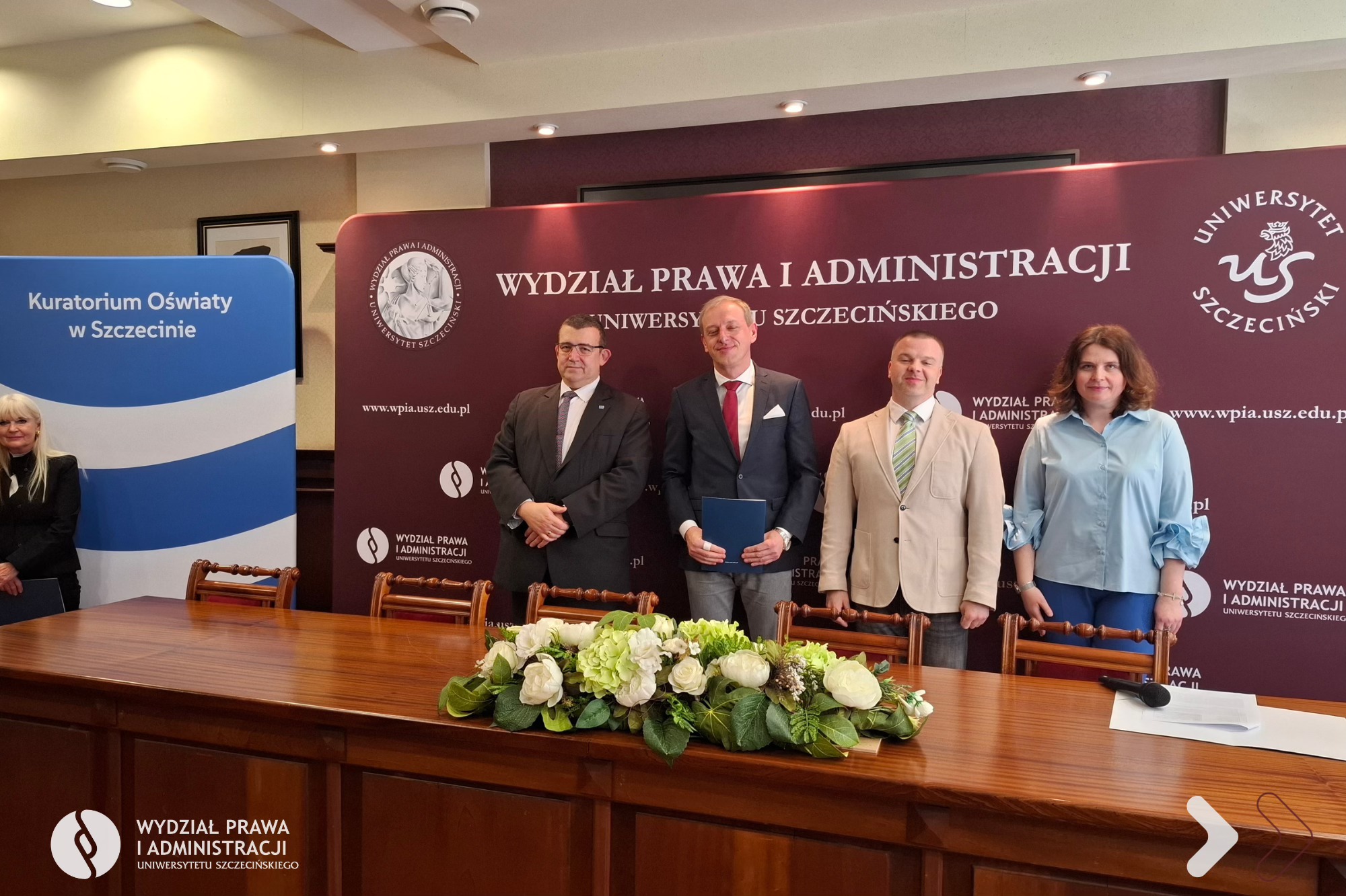 Dnia 25 kwietnia 2026 r. na Wydziale Prawa i Administracji Uniwersytetu Szczecińskiego odbyło się uroczyste zakończenie I edycji Akademii Nowoczesnego Dyrektora Jednostki Oświatowej organizowanej wspólnie z Kuratorium Oświaty w Szczecinie. W kursie dokształcającym uczestniczyło 40 dyrektorów i wicedyrektorów jednostek systemu oświaty z województwa zachodniopomorskiego.