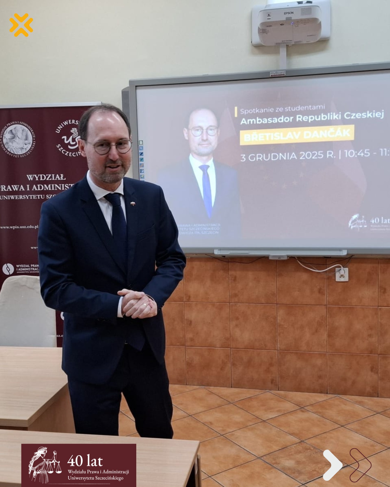 W dniu 3 grudnia 2025 r. na Wydziale Prawa i Administracji Uniwersytetu Szczecińskiego gościliśmy Jego Ekscelencję Břetislava Dančáka – Ambasadora Republiki Czeskiej w Warszawie. Wizyta była okazją do omówienia dotychczasowej współpracy pomiędzy naszym Wydziałem a czeskimi ośrodkami akademickimi, w tym wspólnych projektów, wymiany doświadczeń oraz planowanych działań w kolejnych latach.
