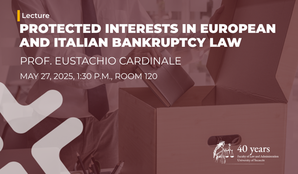 W dniu 27 maja 2025 r. o godz. 13.30 na Wydziale Prawa i Administracji Uniwersytetu Szczecińskiego przy ul. Narutowicza 17a w sali 120 odbył się wykład otwarty pt. „Protected interests in European and Italian bankruptcy law”, w którym udział wzięli członkowie tego Wydziału, społeczność akademicka i zebrani goście. Wydarzenie odbyło się w języku angielskim. Wykład poprowadził Pan Prof. Eustachio Cardinale.
