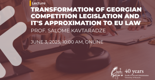 W dniu 3 czerwca 2025 r. o godz. 10.00 na Wydziale Prawa i Administracji Uniwersytetu Szczecińskiego odbył się wykład online pt. „Transformation of Georgian Competition Legislation and its Approximation to EU Law”, w którym udział wzięli członkowie tego Wydziału, społeczność akademicka i zebrani goście. Wydarzenie odbyło się w języku angielskim w formule zdalnej, za pośrednictwem MS Teams i obowiązywała na nie rejestracja. Wykład poprowadziła prof. Salome Kavtaradze – specjalistka z zakresu prawa konkurencji i prawa handlowego.