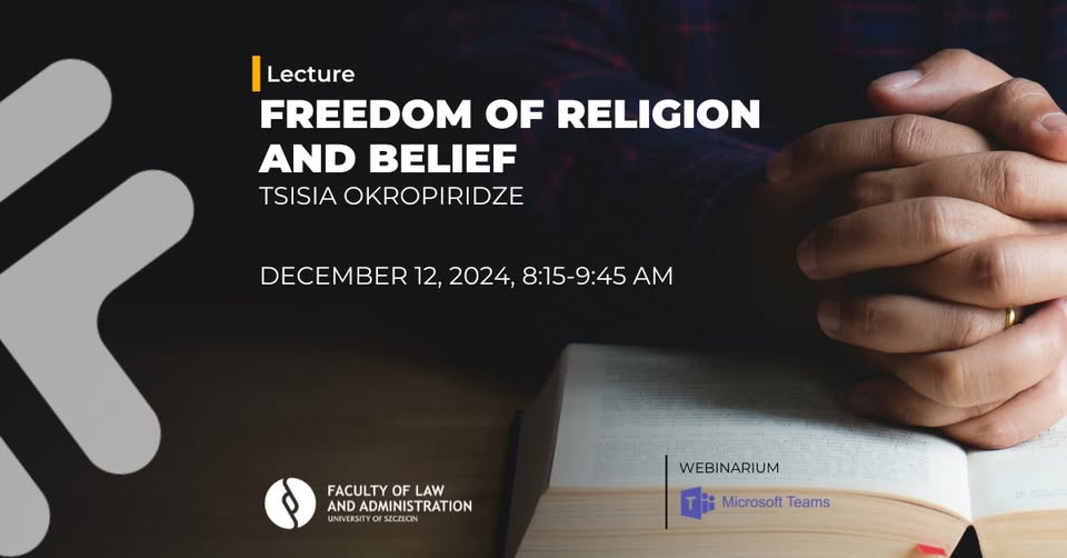 W dniu 12 grudnia 2024 r. o godz. 8.15 na Wydziale Prawa i Administracji Uniwersytetu Szczecińskiego odbył się wykład pt. „Freedom of Religion and Belief”, w którym udział wzięli członkowie tego Wydziału, społeczność akademicka i zebrani goście. Wydarzenie odbyło się w języku angielskim w formule zdalnej, za pośrednictwem MS Teams i obowiązywała na nie rejestracja. Wykład poprowadziła Pani Tsisia Okropiridze z Wydziału Prawa Georgian University of Sulkhan-Saba Orbeliani.