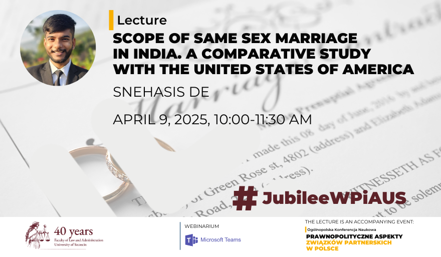 W dniu 9 kwietnia 2025 r. o godz. 10.00 na Wydziale Prawa i Administracji Uniwersytetu Szczecińskiego odbył się wykład pt. „Zakres małżeństw osób tej samej płci w Indiach. Studium porównawcze ze Stanami Zjednoczonymi”, w którym udział wzięli członkowie tego Wydziału, społeczność akademicka i zebrani goście. Wydarzenie odbyło się w języku angielskim w formule zdalnej, za pośrednictwem MS Teams i obowiązywała na nie rejestracja. Wykład poprowadził Pan Snehasis De. Wykład był wydarzeniem towarzyszącym Ogólnopolskiej Konferencji Naukowej „Prawnopolityczne aspekty związków partnerskich w Polsce”, odbywającej się tego samego dnia w Szczecinie.