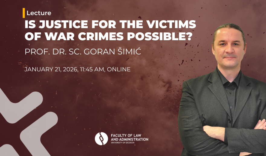 W dniu 21 stycznia 2026 r. o godz. 11.45 na Wydziale Prawa i Administracji Uniwersytetu Szczecińskiego odbył się wykład otwarty online pt. „Czy możliwa jest sprawiedliwość dla ofiar zbrodni wojennych?”, w którym udział wzięli członkowie tego Wydziału, społeczność akademicka i zebrani goście. Wydarzenie odbyło się w języku angielskim w formule zdalnej, za pośrednictwem MS Teams i obowiązywała na nie rejestracja. Wykład poprowadził Pan Prof. dr. sc. Goran Šimić.