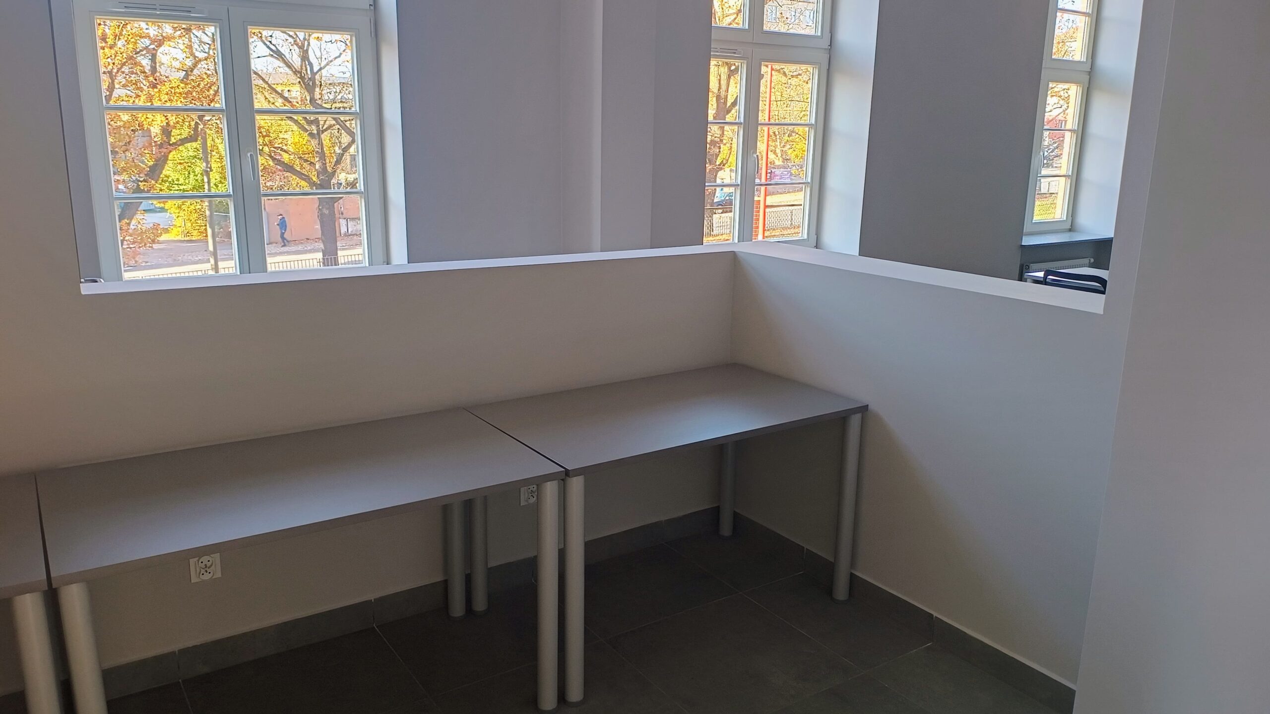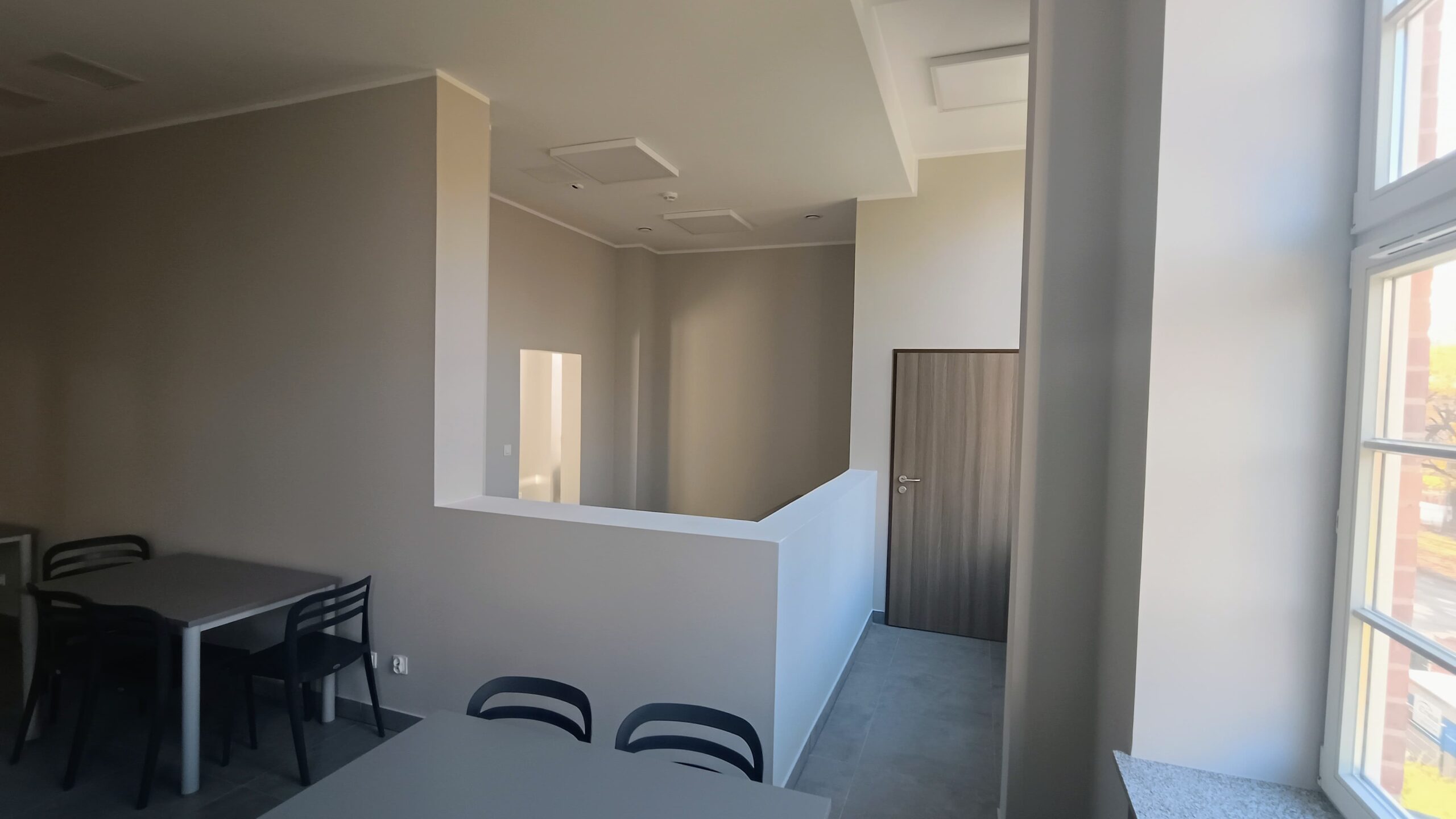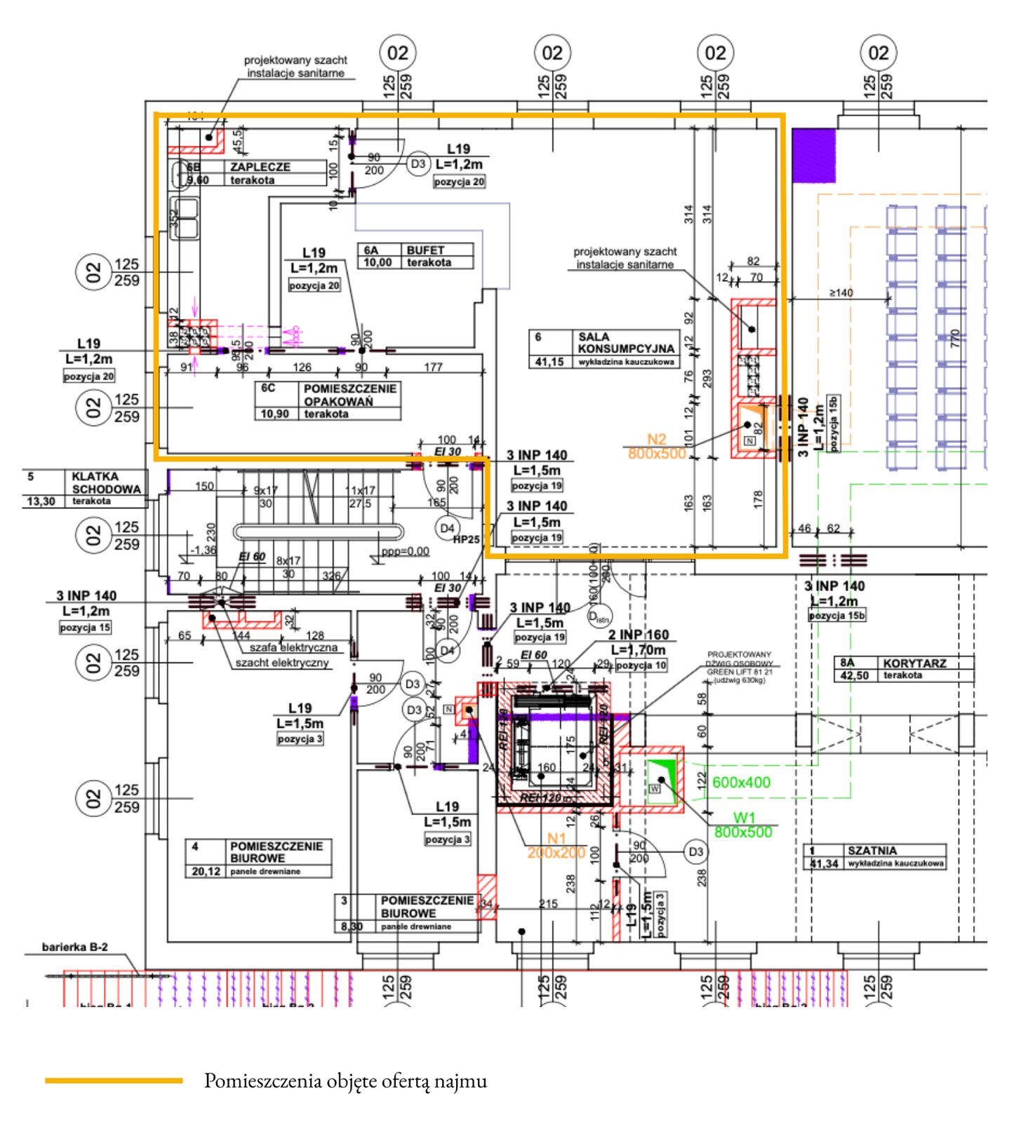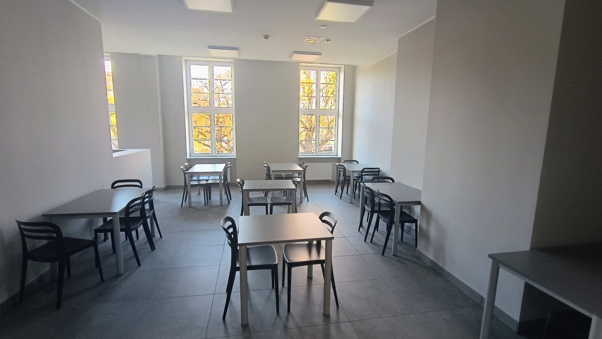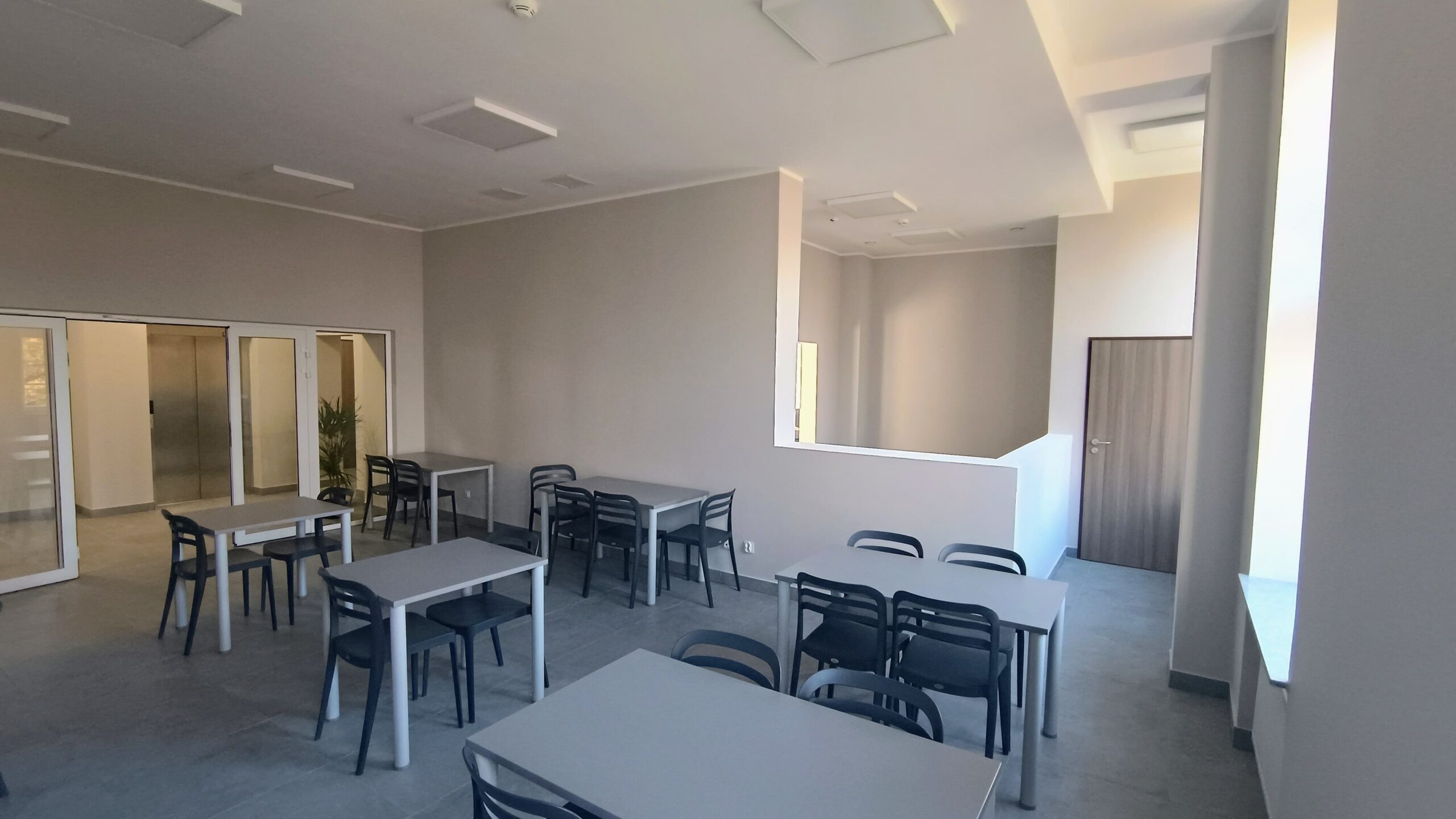 Pomieszczenia posiadają dostęp do węzła sanitarnego. Oferta nie obejmuje wyposażenia lokalu (oprócz stołów i krzeseł w sali konsumpcyjnej). Plan pomieszczeń objętych ofertą najmu (kliknij tutaj). Czynsz: 18,00 zł/m² netto + opłaty za media.