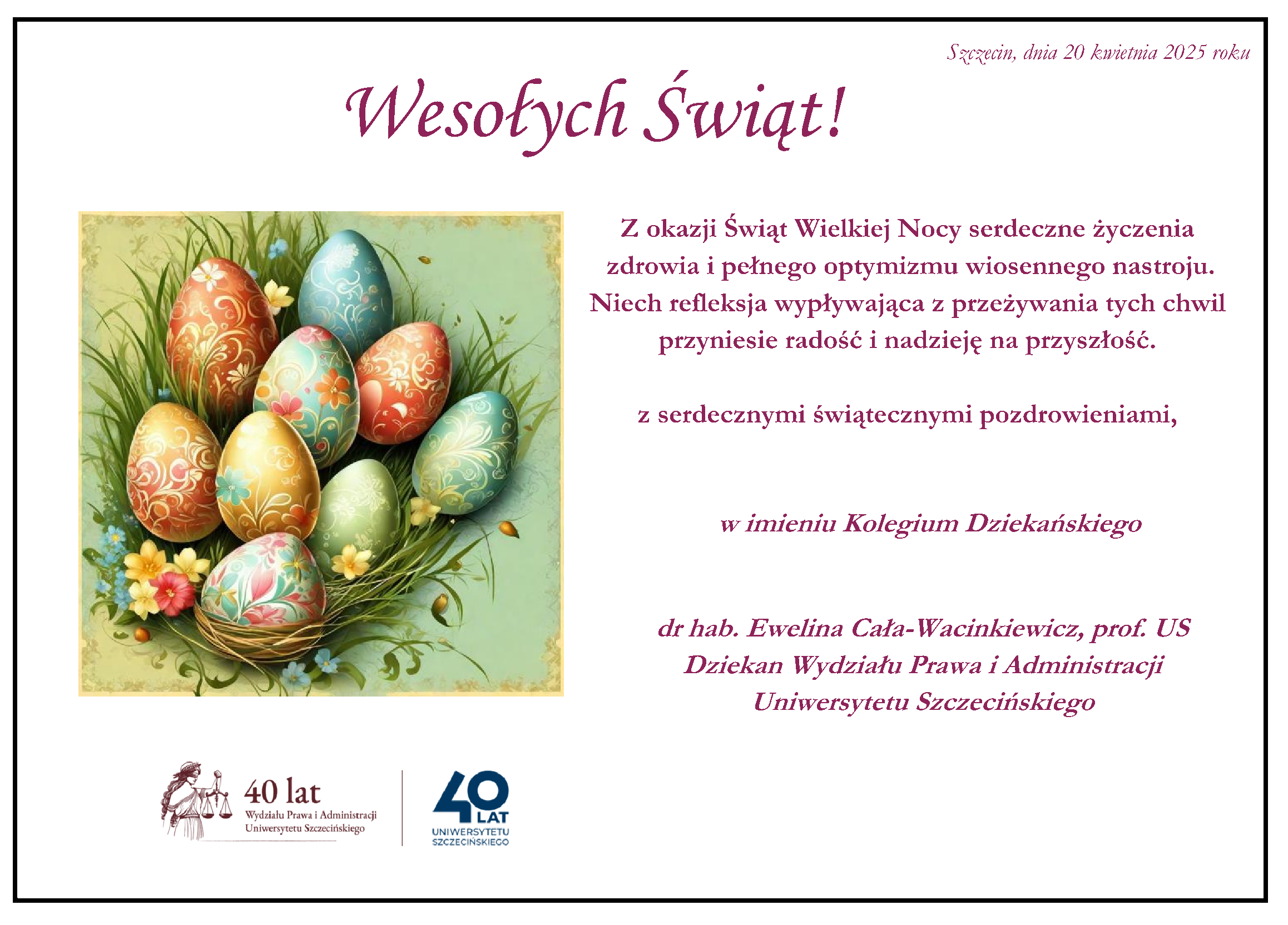 Z okazji Świąt Wielkiej Nocy serdeczne życzenia zdrowia i pełnego optymizmu wiosennego nastroju. Niech refleksja wypływająca z przeżywania tych chwil przyniesie radość i nadzieję na przyszłość.